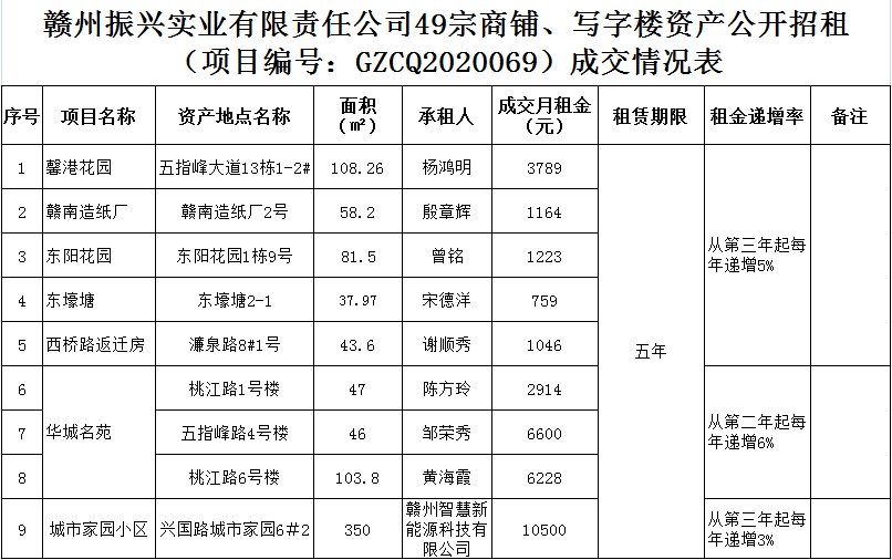 2020年10月27日上午10時(shí),在贛州市公共資源交易中心舉行的贛州振興實(shí)業(yè)有限責(zé)任公司49宗商鋪、寫(xiě)字樓資產(chǎn)公開(kāi)招租(項(xiàng)目編號(hào):GZCQ2020069),現(xiàn)將公開(kāi)招租成交情況公示如下: